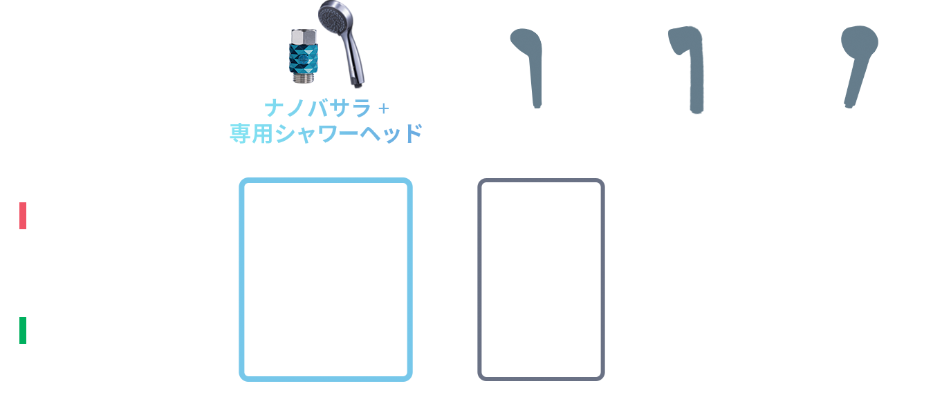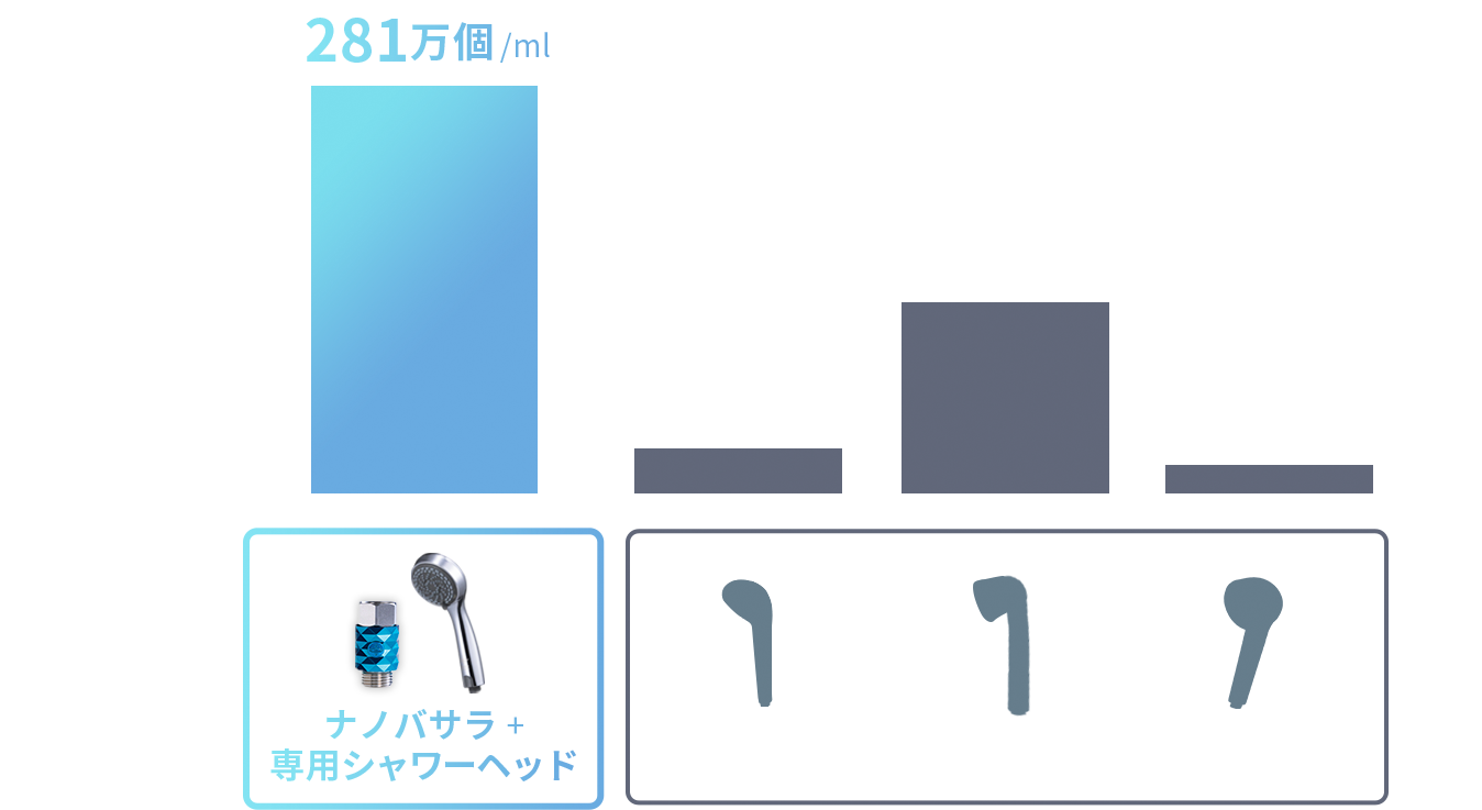 【試験機関】VISIBLE LABO【試験対象】同一の浴室に主要なナノバブル発生シャワーヘッド3種及びナノバサラ(専用シャワーヘッド装着)