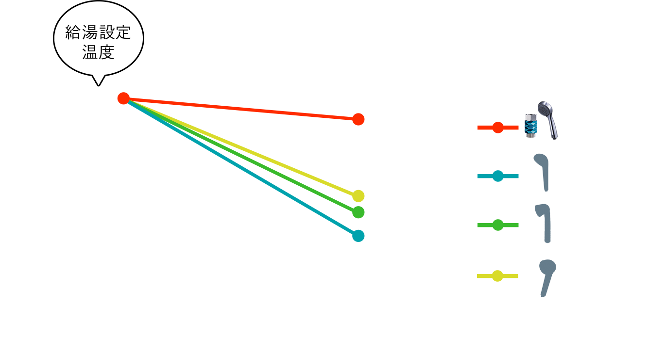 接触式デジタル温度計で測定。各モードそれぞれで実施し、各製品について、全モードの中で最も湯温が下がったモードの測定値をグラフに表示